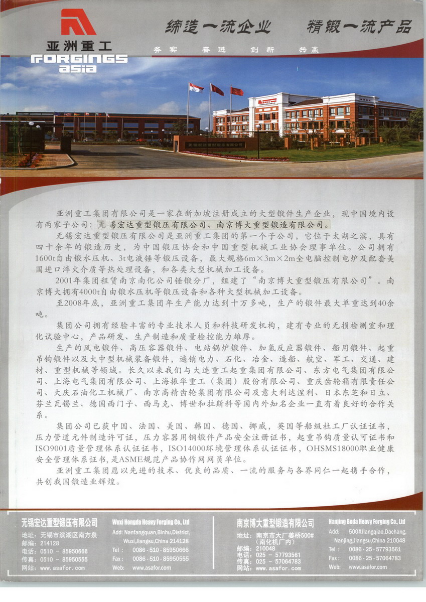 無錫宏達重型鍛壓有限公司是亞洲重工集團的第一個子公司,它位于太湖之濱,具有四十余年的鍛造歷史,為中國鍛壓協(xié)會和中國重機協(xié)會理事單位。公司擁有1600t自由鍛水壓機、3t電液錘等鍛壓設備,最大規(guī)格6m×3m×2m全電腦控制電爐及配套美國進口淬火介質(zhì)等熱處理設備,和各類大型機械加工設備。