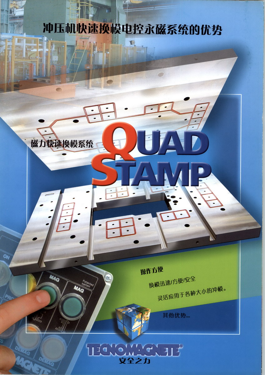 泰磁快速換模系統作為一個完整的解決方案用來滿足先進的制造過程中小批量、多類別生產的JIT(實時生產)和SMED(快速更換)的要求。 采用完美的“雙磁極對流”技術,具有磁場集中,磁吸附力強,不磁化設備,克服間隙能力強,磁穿透高度可控等優(yōu)點。將電控永磁的磁力的應用發(fā)回到極致。 意大利泰磁公司Tecnomagnete S.p.A.始建于1972年,是全球電控永磁產品領域中的領先公司,發(fā)明了一系列革命性創(chuàng)新產品,設計、制造全系列電控永磁夾持及吊重系統。產品包括:注塑機快速換模系統、銑削、磨削、立車、鐵軌加工用電控永磁夾盤、手動永磁吊重器及重型電控永磁吊重設備(用于成卷鋼帶、大型鋼板等的吊運)等。